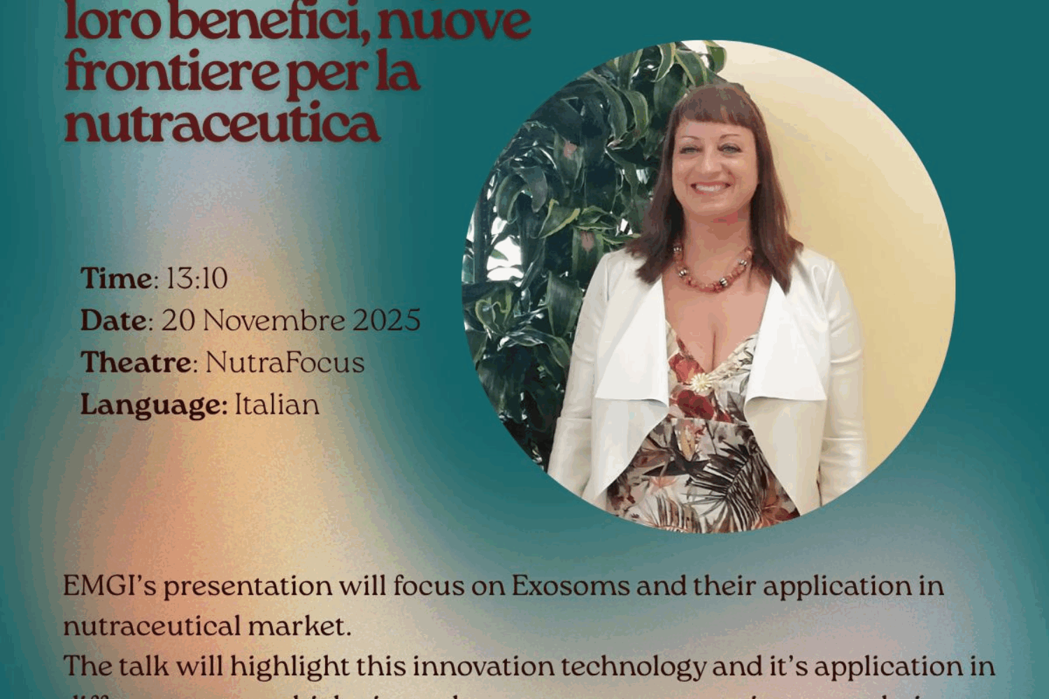 We will discuss this on Thursday, November 20, at 1:10 p.m. at NutraFocus in-Vitality with Dr. Barbara Cecilia Aghina from ExoLab—an opportunity not to be missed for those involved in research who want to understand how this innovation could transform the future of nutraceutical products.